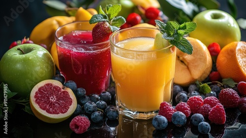 Two cocktail glasses of apple and multivitamin juices, with a variety of fresh fruits adding color to the scene.