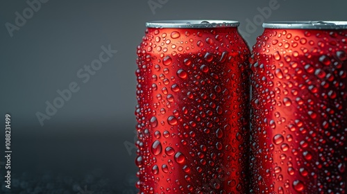 Two Cold Red Aluminum Cans with Condensation, Refreshing Beverage on a Dark Background, with copy space