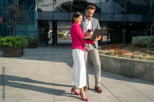 Two colleagues are concentrating and thinking, a man and a woman in business clothes are discussing business strategy, a group of business people outside an office building