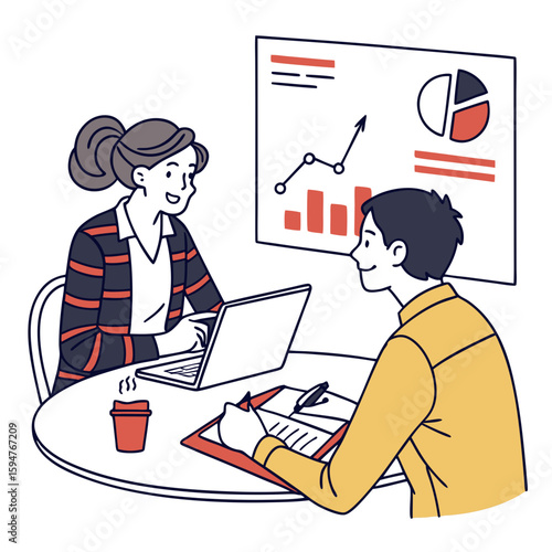 meeting, business, people, team, work, collaboration, laptop, computer, chart, graph, datum, analysis, discussion, planning, strategy, office, workspace, desk, table, woman, man, professional, corporate, presentation, report, project, teamwork, communication, conversation, female, male, adult, illustration, drawing, clip art, design, modern, simple, clean, minimal, red, yellow, black, white, line, graphic, digital, technology, productivity