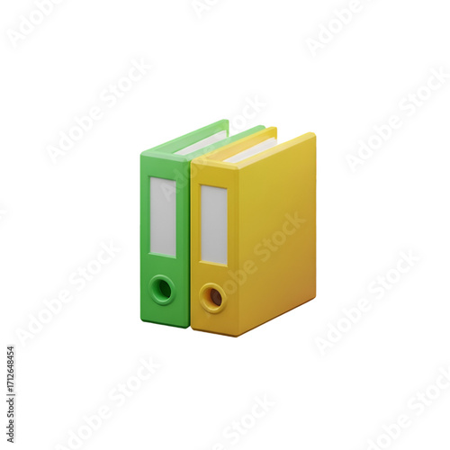 Two colorful 3d binders, one green and one yellow, isolated on transparent background