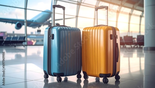 suitcase, aerodrome, travel, plane, blue, yellow, plastic, baggage, modern, traveler, journey, transport, terminal, waiting, vacation, holiday, carry-on, wheel, cabin, flight, departure, arrival, tour tourism, trip, passenger, baggage, carry, destination, horizon, sunlight, interior, contemporary