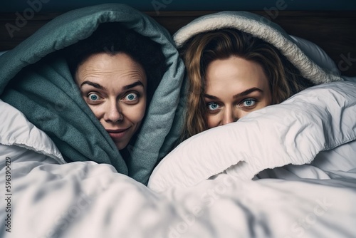 Two confidant friends cover themselves with a blanket up to their heads, intimate women. Ai generated.