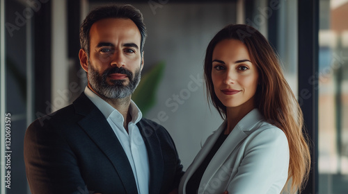 Two confident business professionals in formal attire, embodying professionalism and collaboration.