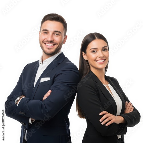 professional, business, attire, confident, smiling, man, woman, side, standing, arm, crossed, suit, attaching, blouse, jacket, pant, skirt, shoe, office, work, career, success, team, partnership, collaboration, corporate, executive, leader