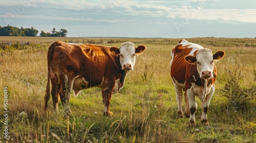cow, cow, meadow, grass, field, sky, cloud, brown, white, rural, farm, animal, mammal, nature, landscape, green, wildflower, pasture, countryside, outdoors, agriculture, farm animal, cattle, horn, hoof, sunny, day, summer, peaceful, tranquil, calm, beautiful, open, wide, horizon, farmland, grazing land, natural