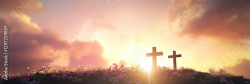 Two crosses on the hill. Dramatic sky with sun and clouds.