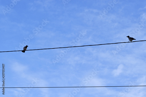 view, landscape, background, texture, sky, clear, blue, beautiful, light, bird, crow, 2, black, small, to sit, look, wire, thin, perspective, nature, weather, good, air, day, winter, life