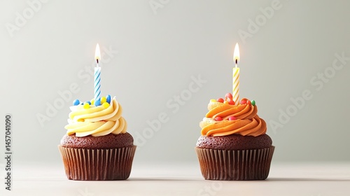 Two cupcakes with frosting and candles, side-by-side against a light background.