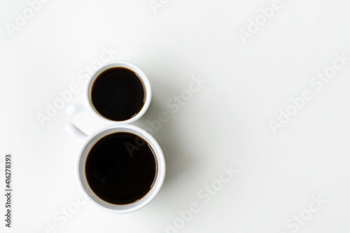 Two cups of black coffee are in the shape of an eight on the white table