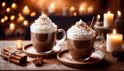 two cups of hot chocolate with whipped cream on a wooden table the cups are placed next to each other and there are candles in the background the scene gives off a cozy and warm atmosphere