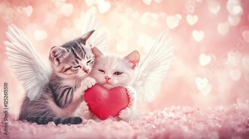 Two cute cats with angel wings, holding a heart together, radiating love and joy in a soft, heart-filled pink setting for Valentine's Day