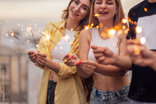 cute, guy, charming, girl, holding, sparkler, smiling, friends, casual attire, clothes, fun, laugh, 4, teenage, celebrate, date, holiday, party, happy, white, caucasian, people, adult, friendship, celebration, freedom, outdoors, summer, adolescence, enjoyment, cheerful, joy, lifestyle, togetherness, rooftop, children, city, carefree, patio, student, beauty, playful, community, female, male, burning, emotion, excitement, illuminated