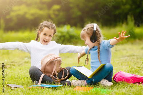 two cute multicultural schoolgirls sitting on lawn under tree and reading book together