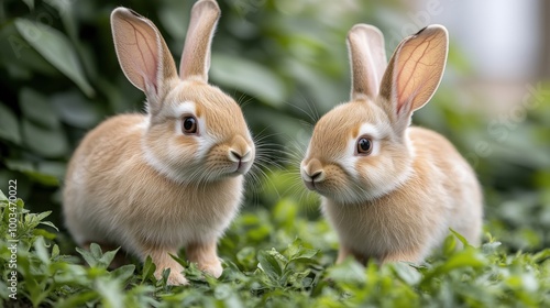 Two cute rabbits sitting on fresh green grass in a vibrant garden setting.