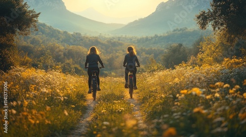 Two cyclists riding on a scenic path through a flower-filled landscape at sunset.