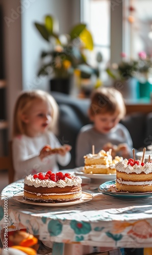 cake, dessert, children, table, berry, whipped cream, party, celebration, food, sweet, snack, indoor, home, family, festive, eating, childhood, bakery, pastry, delicious, treat, blurred background, cosy, dining, gathering, kitchen, homemade, epicure, baking, joyful, playful, happy, event, special occasion, vibrant, colourful