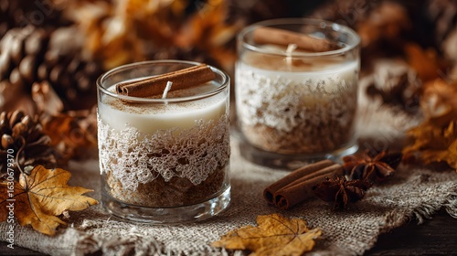 candle, cinnamon, leaf, fall, autumn, cosy, decoration, glasses, still life, warm, aroma, season, decorative, burlap, clothes, pine cone, spice, wax, flames, fire, light, fragrant, scent, holiday, celebration, star, anise, rustic, table, wood, interior, design, home, hand-made, craft, bricolage, country, natural, brown, white