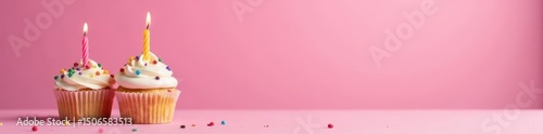 Two delicious birthday cupcakes with lit candles, pastel pink background , joy, adorable