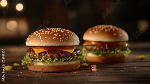 Two delicious cheeseburgers with sesame seed buns and fresh ingredients on a rustic wooden table