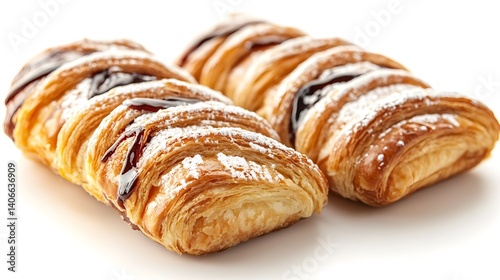 Two delicious golden brown pastries with chocolate glaze and powdered sugar are displayed on a white background.