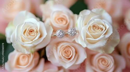 Two diamond engagement rings surrounded by delicate peach roses on soft pink background, romantic wedding theme, elegant floral decoration, marriage proposal.
