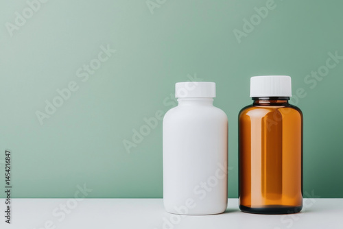 Two different bottles on a surface with a green background.