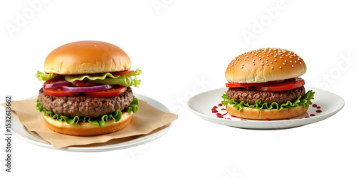 two distinct homemade hamburgers displayed on plates one with sesame seed bun and the other without isolated on a transparent background with sauce accent