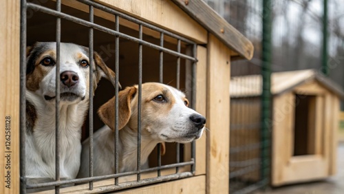 two dogs looking out from their kennel at a dog shelter. The dogs are both looking hopeful and seem to be waiting patiently for someone to adopt them.