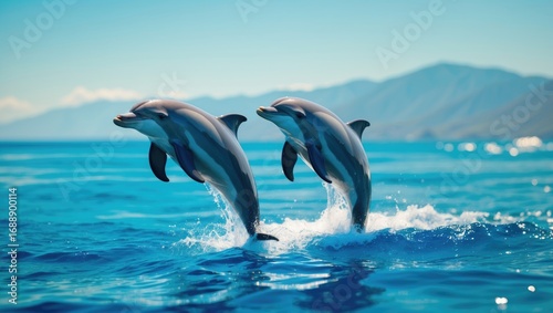 Two dolphins jumping out of the water in the ocean with a mountainous background.