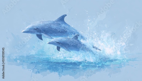 Two dolphins leap from calm, blue water, creating splashing watercolor-like effect