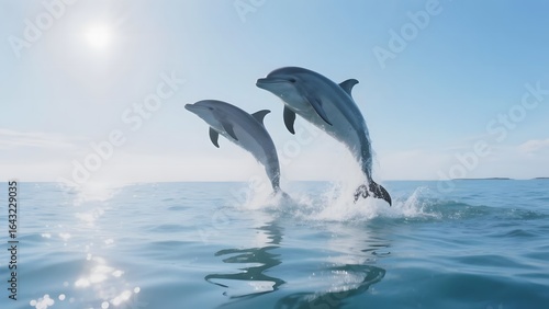 Two dolphins leap gracefully out of the ocean under a clear blue sky.