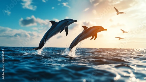 Two dolphins leap out of the ocean, their sleek bodies silhouetted against the setting sun. The vibrant blue water and the clear sky create a stunning backdrop for this playful moment, symbolizing fre