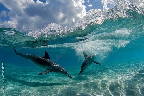 Two dolphins swimming underwater near ocean surface