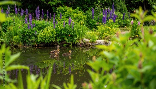 Two ducklings swim in a pond bordered by lush greenery and purple lupine flowers.
