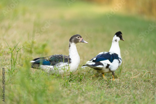 duck, bird, wildlife, nature, animal, animal, grass, field, meadow, countryside, black, white, blue, plumage, closeup, farm animal, organic, calm, serene, peaceful, portrait, fowl, natural, grassy, cute, pet, domestic, spring, summer, photo, outdoors