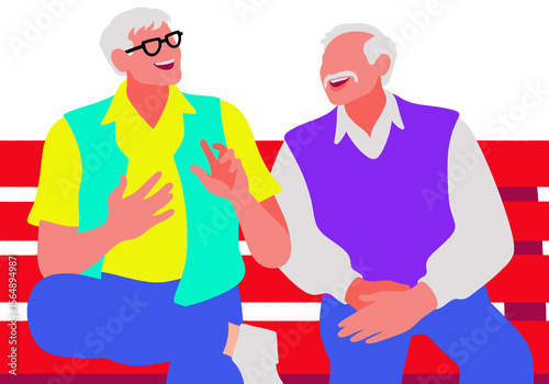 Two elderly men laugh and chat on a bright red bench with colorful attire. Illustration