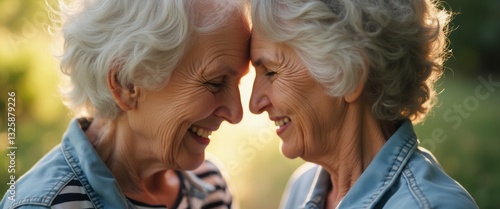 Two elderly women with radiant smiles lean their foreheads together, sharing a moment of pure joy in a sunlit outdoor setting. Their silver hair glistens in the warm light, and the soft background of