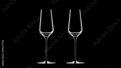 two Elegant champagne flutes filled with sparkling bubbly Over black Studio Background.