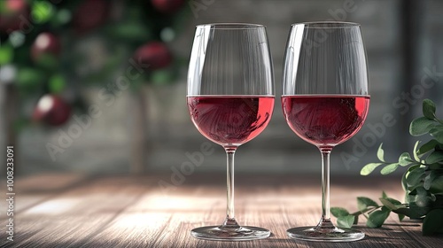Two elegant glasses of red wine sit on a wooden table, surrounded by a cozy ambiance perfect for gatherings and celebrations.