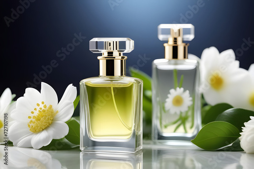 perfume, bottle, flower, white, blue, elegant, isolated, background, glasses, gold, cap, center, vibrant, solid, colours, photo, product, beauty, fashion, luxury, scent, fragrance, aroma, cosmetic, floral, nature, still life, minimal, simple, clean, modern, stylish, trendy, generative, ai