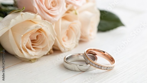 Two elegant wedding rings beside soft pink roses on a wooden surface, symbolizing love and commitment.