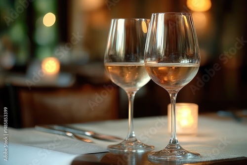 Two elegant wine glasses filled with white wine on a neatly set table with soft warm ambient lighting creating a cozy and inviting atmosphere