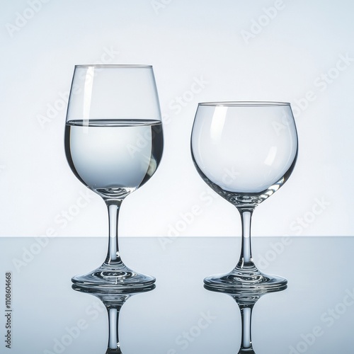 Two Elegant Wine Glasses One Filled with Water, One Empty - Studio Photography
