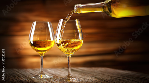 Two elegant wine glasses with white wine being poured; a moment of refined indulgence and timeless elegance.