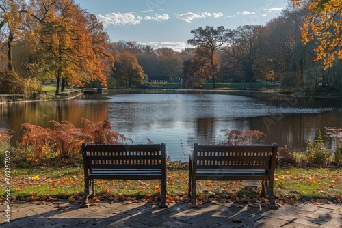 Two empty benches facing a calm lake surrounded by trees with autumn leaves under a clear sky