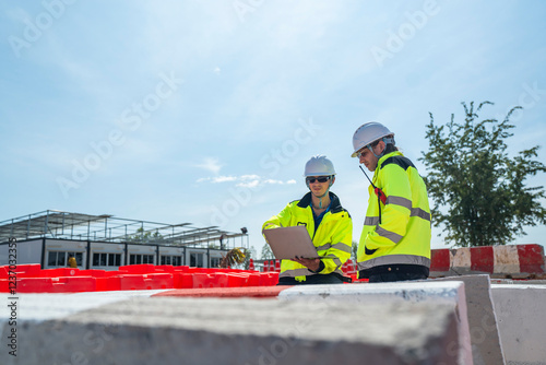 Two engineers wearing high visibility jackets discuss construction progress near concrete barricades on-site. One holds a laptop, symbolizing modern planning and collaboration in civil engineering.