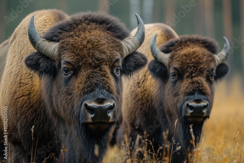bison, animal, wildlife, nature, mammal, field, grass, forest, autumn, endangered species, powerful, majestic, wild, brown, horn, hoof, fur, big, large, heavy, strong, herbivore, grazing, ruminant, bovine, ungulate, front view, no people, day, copy space, horizontal
