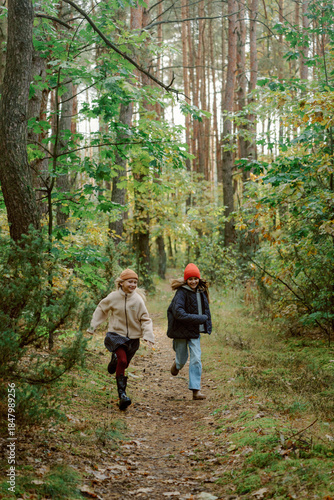 friendship, children, sibling, forest, adventure, laughter, happiness, play, playful, fun, outdoors, wood, running, nature, joy, exploring, sunlight, path, timberland, excitement, discovery, childhood, greenery, tree, foliage, trail, cheerful, jacket, hat, green, companionship, youth, seasonal, carefree, freedom, energetic, landscape, movement, environment, fresh air, explore, scenic, brightness, active, lush, trousers, spirited