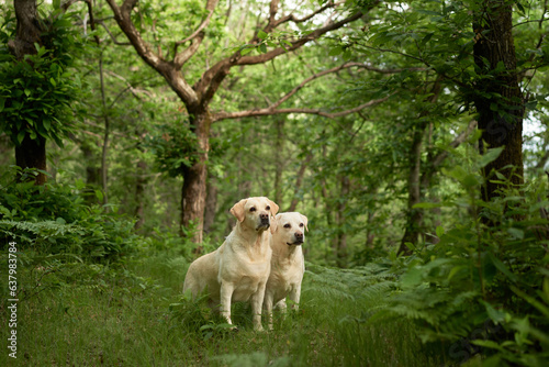 two fawn labradors retrievers in the forest. Dogs stands on background of greenery . Pet travel in nature
